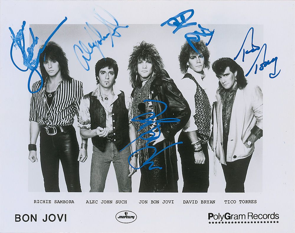 Glossy 10 x 8 PolyGram Records publicity photo, signed in blue ink by Jon Bon Jovi, Richie Sambora, Alec John Such, David Bryan, and Tico Torres. In fine condition, with some brushing and irregular adhesion to a couple of signatures.