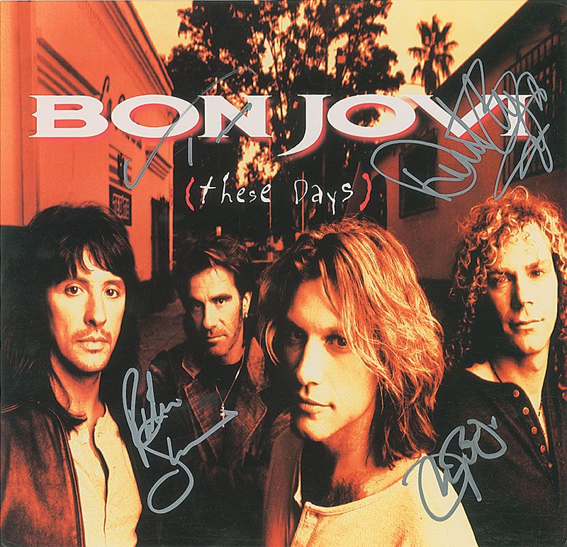 These Days album flat signed on the front in silver ink by Jon Bon Jovi, Richie Sambora, Tico [Torres], and David Bryan. In fine condition.