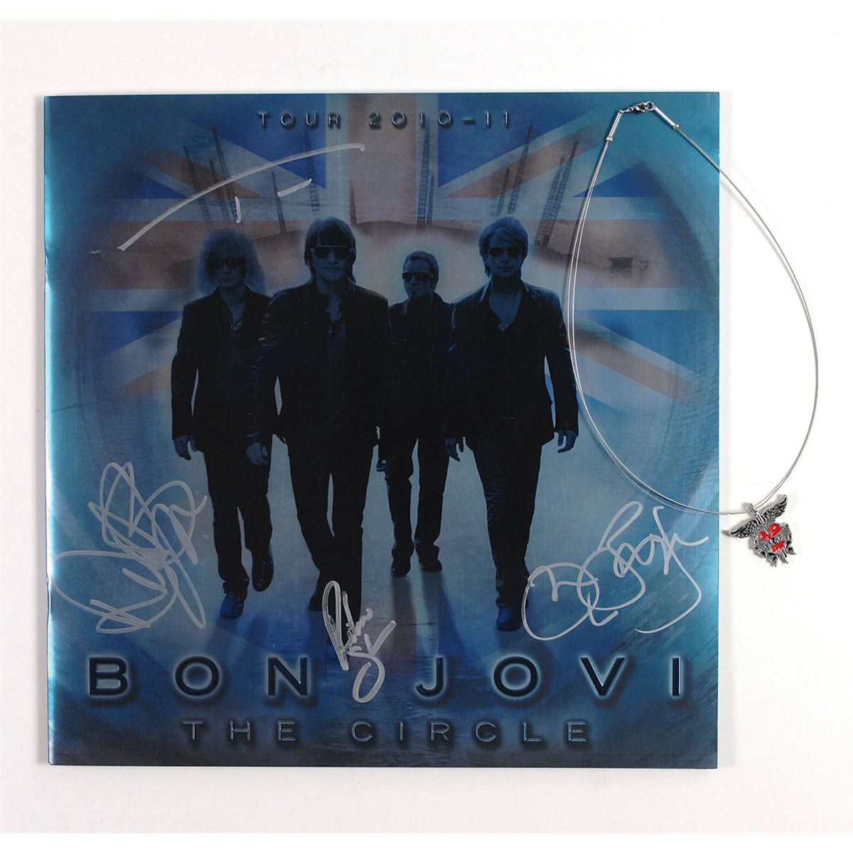 The Circle 2010–2011 tour program, 12 x 12, signed on the front cover in silver ink by Jon Bon Jovi, Richie Sambora, Tico Torres, and David Bryan; and two guitar strings used by Jon Bon Jovi and Richie Sambora, and made into a pendant with a Bon Jovi logo. In fine condition. Accompanied by two certificates of authenticity from Bonjovi.com.