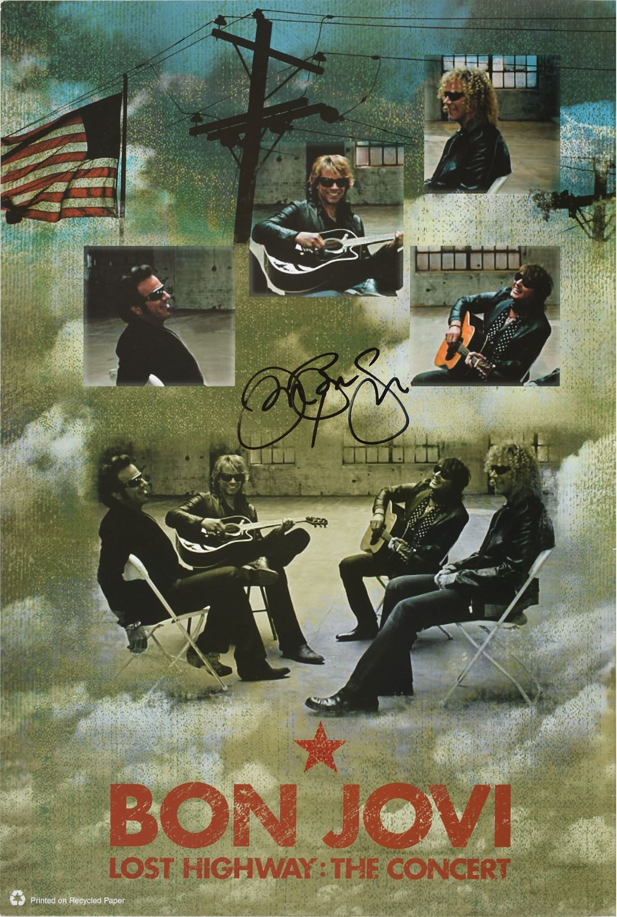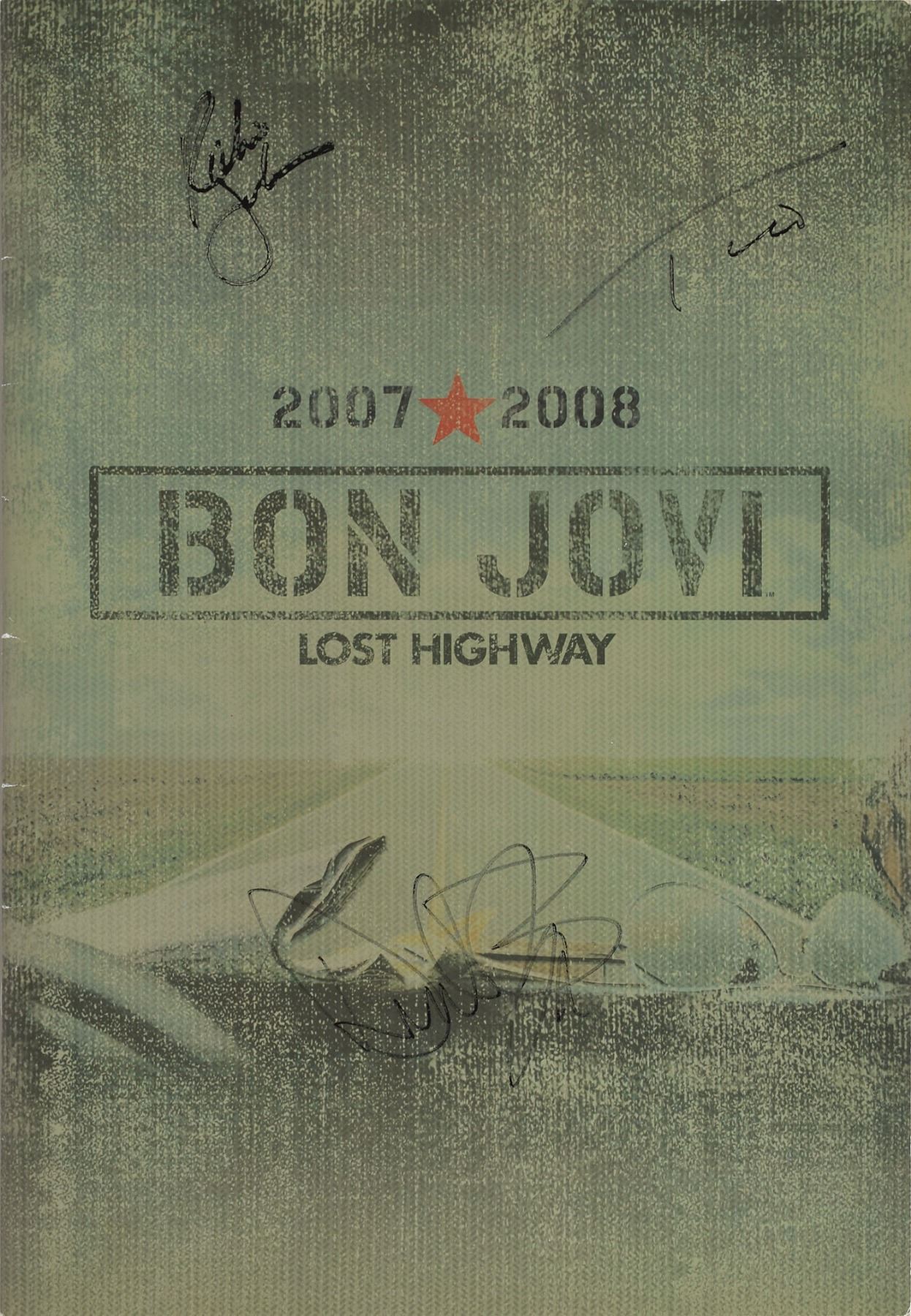 Program for the 2007–08 Lost Highway tour, 11 x 16, signed on the front cover in black felt tip by Richie Sambora, Tico Torres, and David Bryan, and on the inside front cover by Jon Bon Jovi. In fine condition, with light skipping to the cover signatures due to the slick surface.