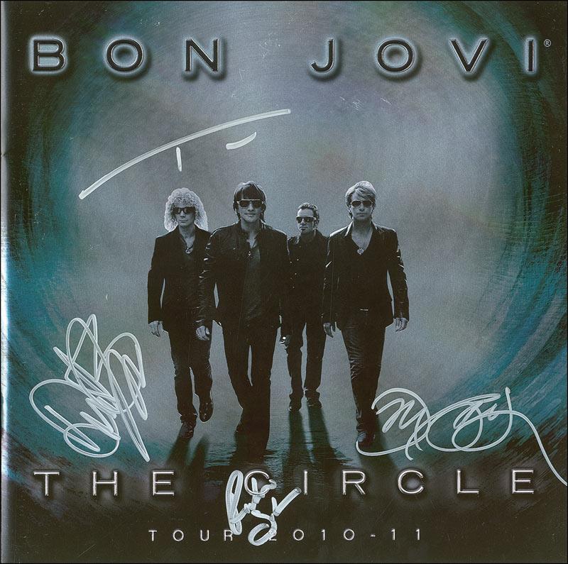 Bon Jovi 2010–2011 The Circle tour program, signed on the front cover in silver ink by Jon Bon Jovi, Richie Sambora, Tico Torres, and David Bryan. In fine condition. Accompanied by a full letter of authenticity by Roger Epperson (REAL).