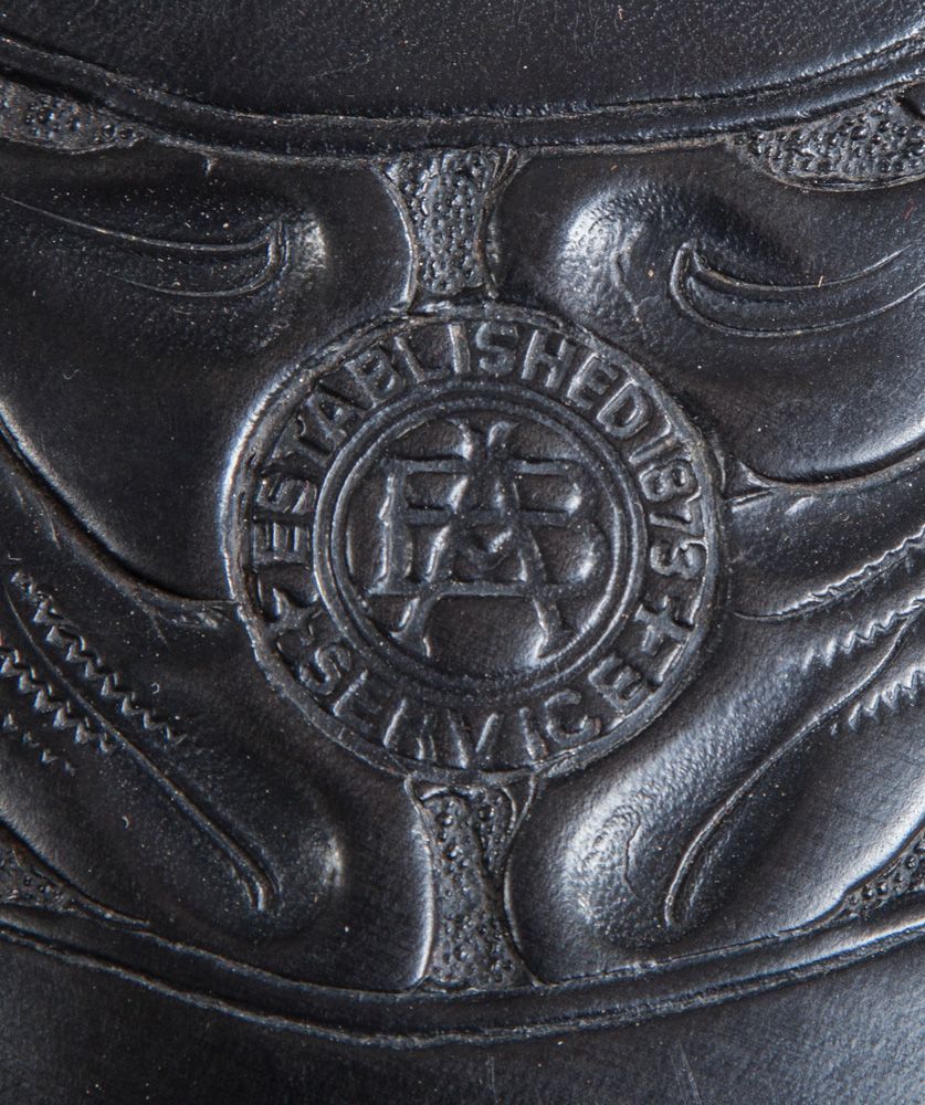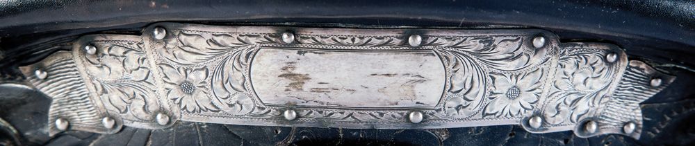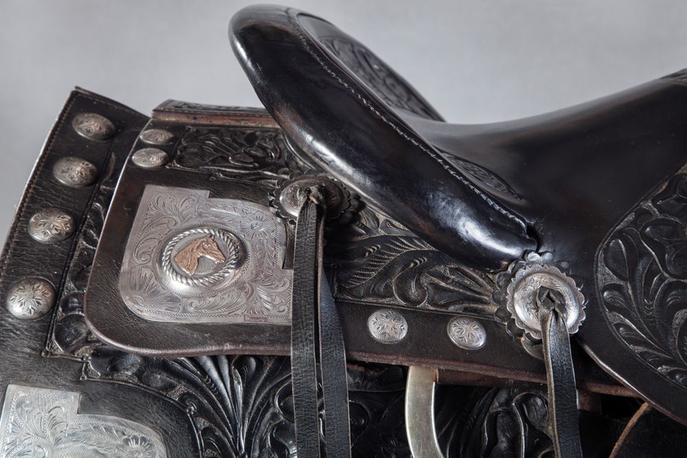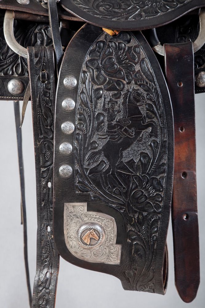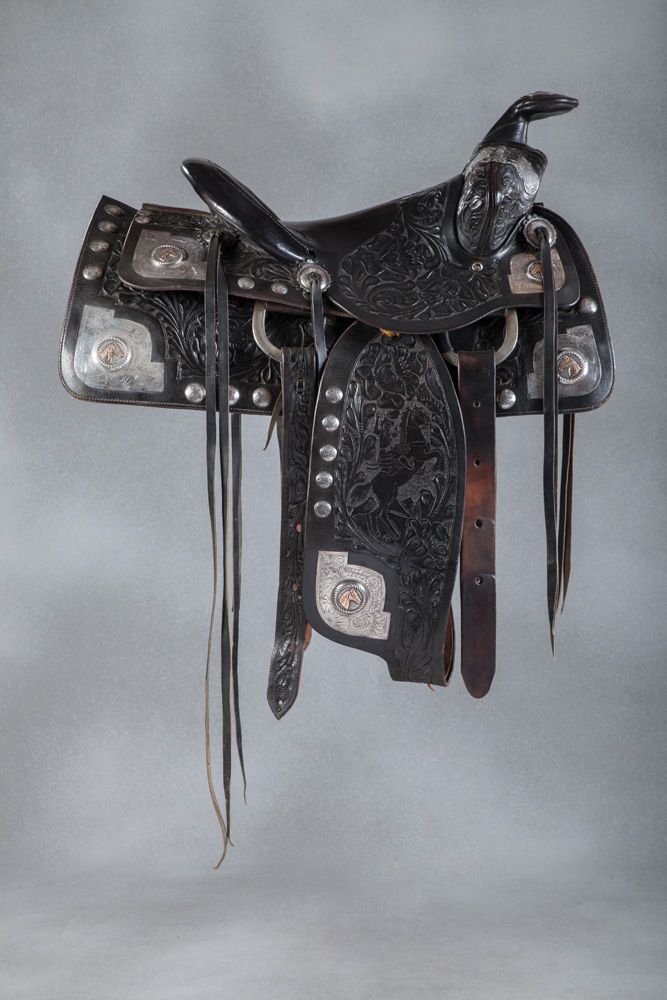 Bona Allen Silver and Gold Mounted Show Saddle. Maker-stamped on the seat with "B/A" and the 1873 saddlery founding date, this black floral carved Georgia saddle, bridle and bit features a rearing horse and rider on the fenders, finely engraved corner plates with gold horseheads and 1" engraved and domed sterling conchos around the perimeter. Fine rideable condition, circa 1940s. Bona Allen, Buford, Georgia was established in 1873. Originally known as a tanner and manufacturer of horse collars, harness & saddlery, Bona Allen went on to become one of the biggest and most respected makers in the South with a broad line of riding saddles that included some higher end and silver mounted styles.