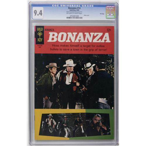<B>Bonanza #14 File Copy (Gold Key, 1965) CGC NM 9.4 Off-white to white pages.</B></I> Photo cover. Overstreet 2006 NM- 9.2 value = $95. CGC census 8/06: 8 in 9.4, 3 higher. <I>From the Random House Archives</B></I>.