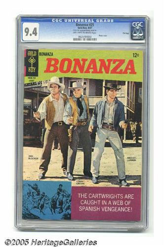 <B>Bonanza #25 File Copy (Gold Key, 1967) CGC NM 9.4 Off-white to white pages.</B></I> Photo cover featuring Hoss, Ben, and Little Joe. Overstreet 2005 NM- 9.2 value for group = $80. CGC census 4/05: 1 in 9.4, none higher. <I>From the Random House Archives.</B></I>