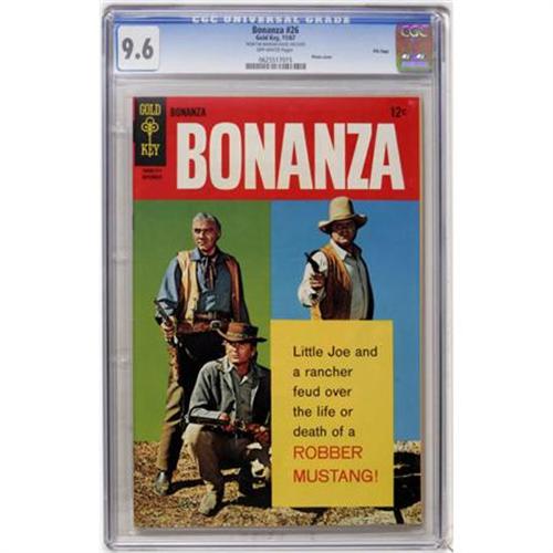 <B>Bonanza #26 File Copy (Gold Key, 1967) CGC NM+ 9.6 Off-white pages.</B></I> Photo cover. CGC notes, "From the Random House Archives." Overstreet 2007 NM- 9.2 value = $80. CGC census 10/07: 4 in 9.6, none higher.<BR><BR><b>Shipping:</b> Comics - Slabbed (certified) (<a target="_blank" href="http://www.heritageauctions.com/common/shipping.php">view shipping information</a>)
