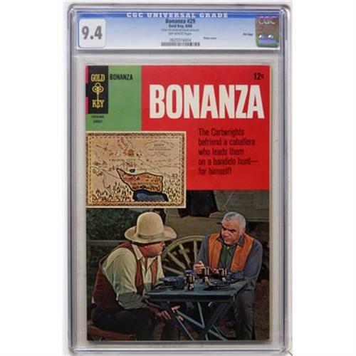 <B>Bonanza #29 File Copy (Gold Key, 1968) CGC NM 9.4 Off-white pages.</B></I> Photo cover. CGC notes, "From the Random House Archives." Overstreet 2007 NM- 9.2 value = $80. CGC census 9/07: 4 in 9.4, 1 higher.<BR><BR><b>Shipping:</b> Comics - Slabbed (certified) (<a target="_blank" href="http://www.heritageauctions.com/common/shipping.php">view shipping information</a>)