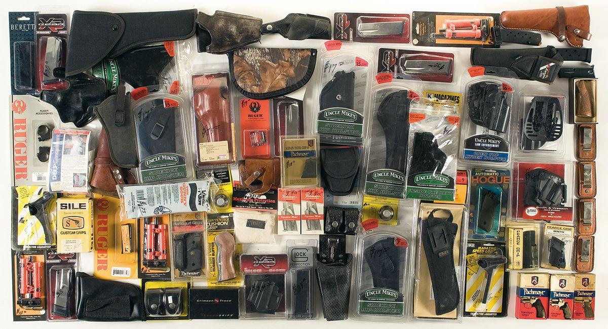 Large selection of grips for various handguns. Crimson Trace Laser grips for a 1911 style pistol as well as a set for Taurus small frame revolvers and a large selection of holsters. High capacity magazines, revolver and pistol magazine speed loaders, duty belt pouches, including magazine pouches, revolver speed loader pouches, a handcuff case and pepper spray pouch, and various pistol cases and rugs.