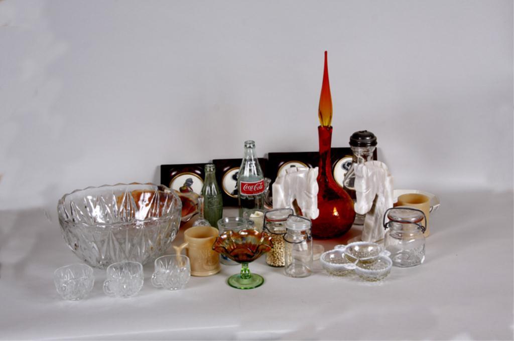 Bonanza Glass Lot Including a crystal punch bowl with matching cups, glass candle holder, a jar, Lenox crystal vase, 2 collector mugs, 2 crystal bells, an antique Coke bottle, an orange carnival glass bowl, a carnival glass candy dish, a set of white marIncluding a crystal punch bowl with matching cups, glass candle holder, a jar, Lenox crystal vase, 2 collector mugs, 2 crystal bells, an antique Coke bottle, an orange carnival glass bowl, a carnival glass candy dish, a set of white marble horsebookends, a small porcelain Nippon bowl with handpainted candy design, and other glass items.