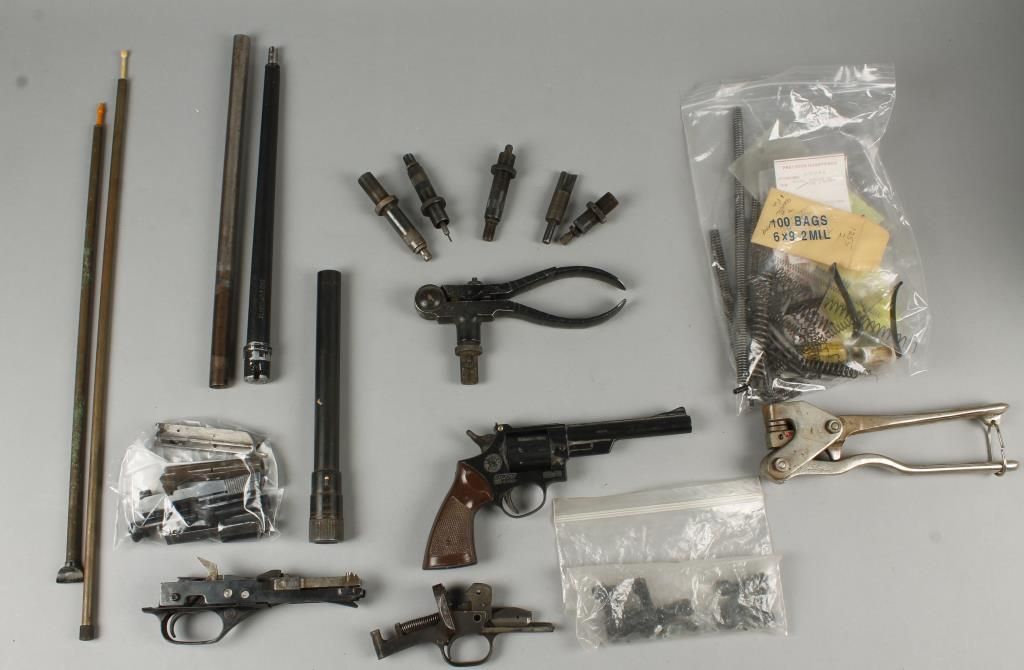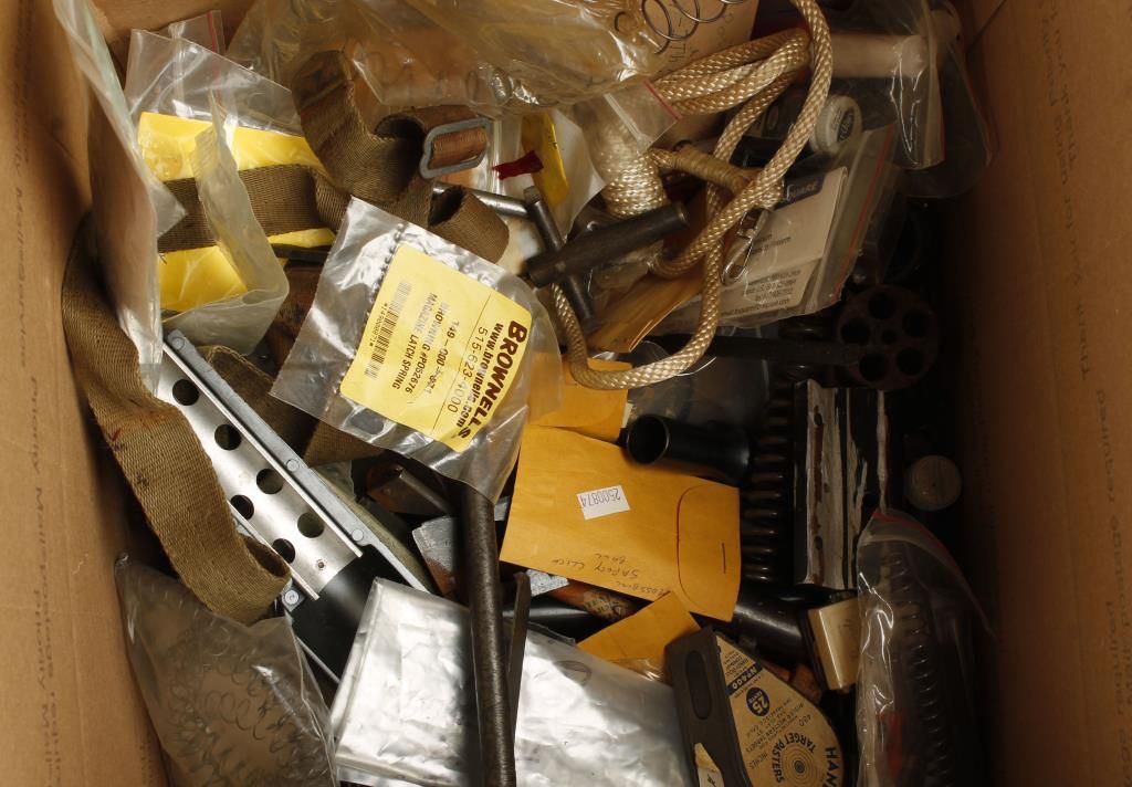 Large amount of gun parts, springs, magazine tubes, screws , pins, two Beretta pistol barrels, 3 rifle bolts, and much much more.