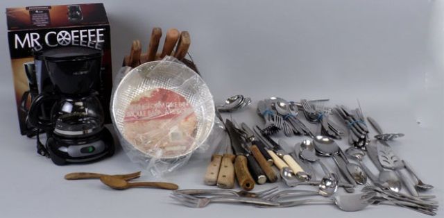 cake pan, knives, a multitude of kitchen utensils and flatware.