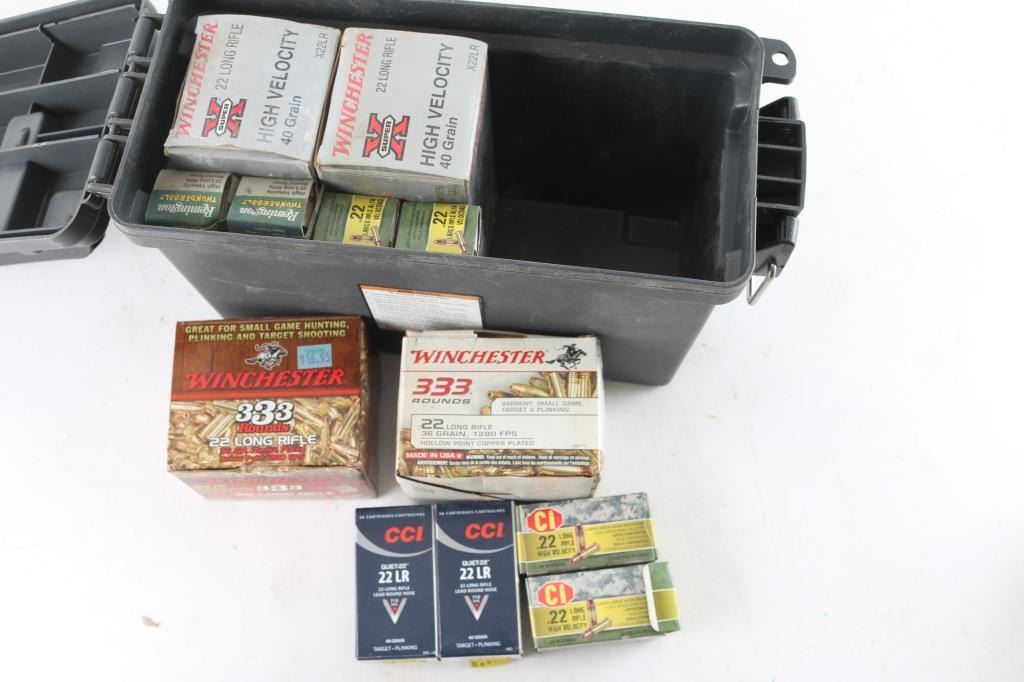 Approx. 2266 rounds of factory new 22 Long Rifle ammunition. Remington and Winchester, hollow pts and FMJ, in factory boxes. All in plastic ammo can.