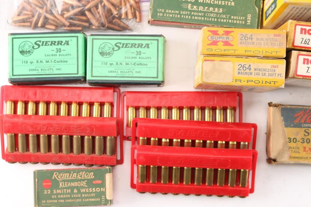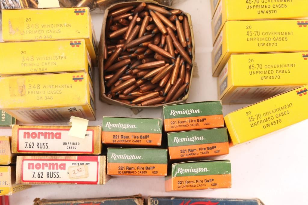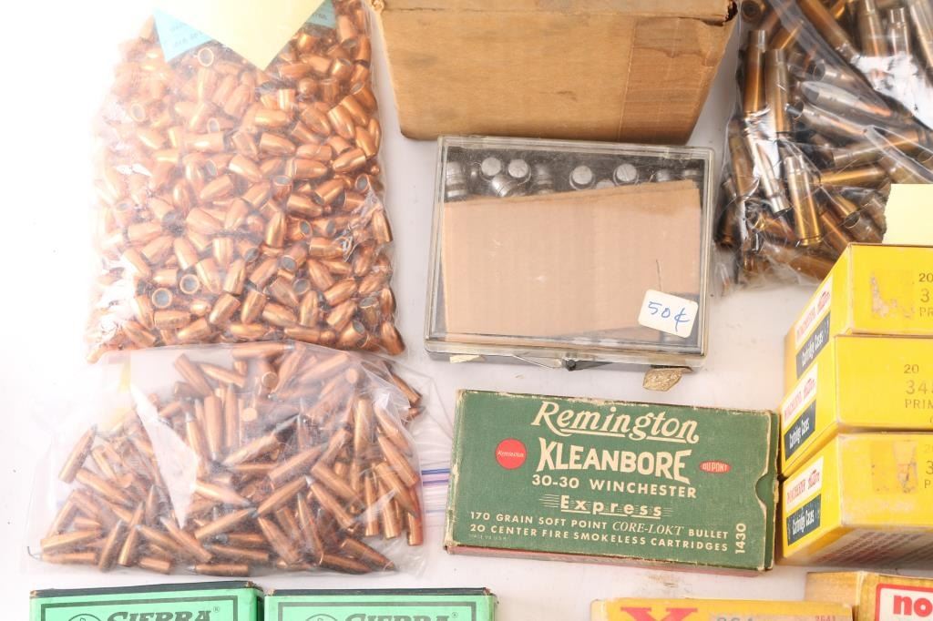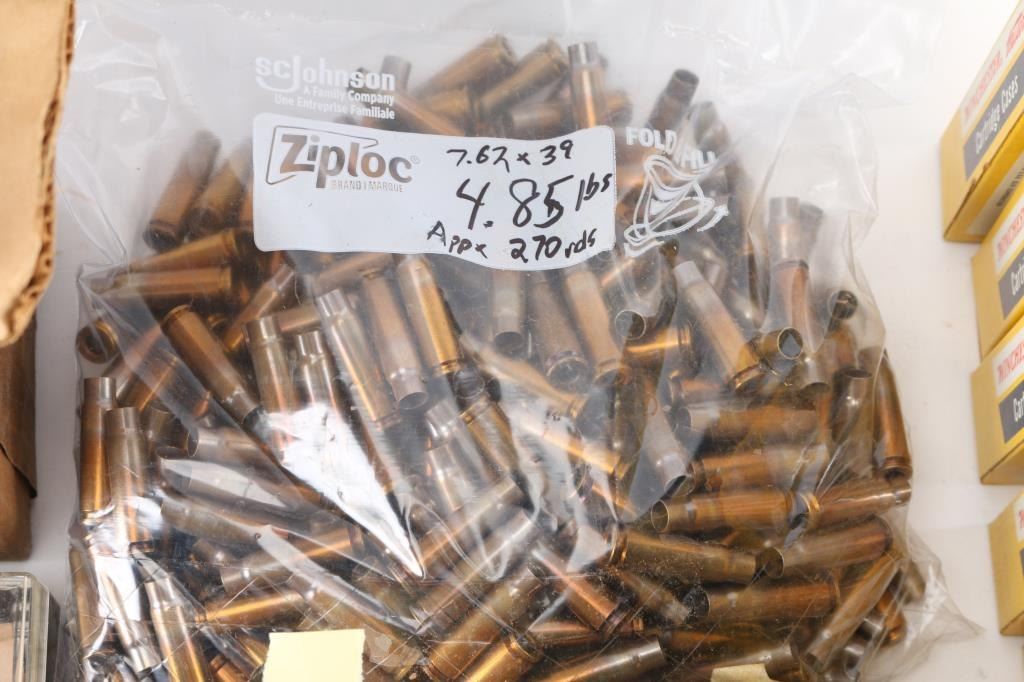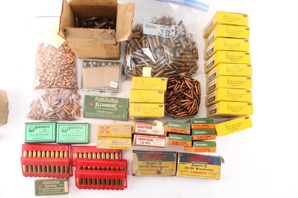 Includes: Various brass for 30-30, .221 REM, 7.62 RUSS, .264 Magnum, .348 WIN, ,32 S&W, .310, 30-06, .300 H&H MAG, (4.85lbs) 7.62x39. (200) Sierra 30 caliber 110gr bullets, (Apprx. 500) 9mm bullets, (Apprx. 140) 7.62mm bullets.****Counts are approximate (+/-)****