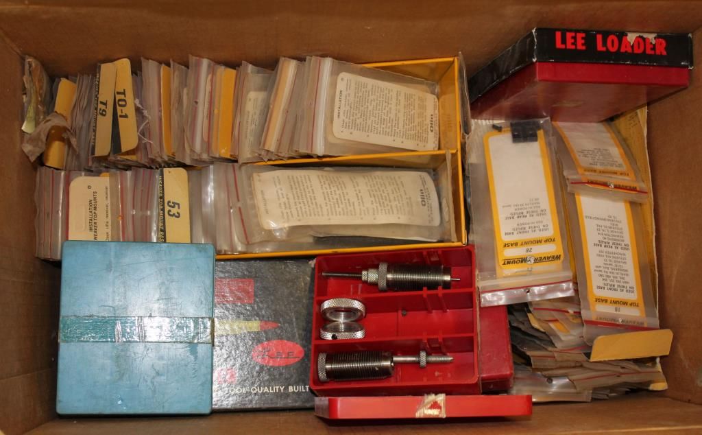 Includes Weaver top mount bases, assorted dies and loaders, Burris universal scope mount bases, plus Redfield and Weaver scope mount bases