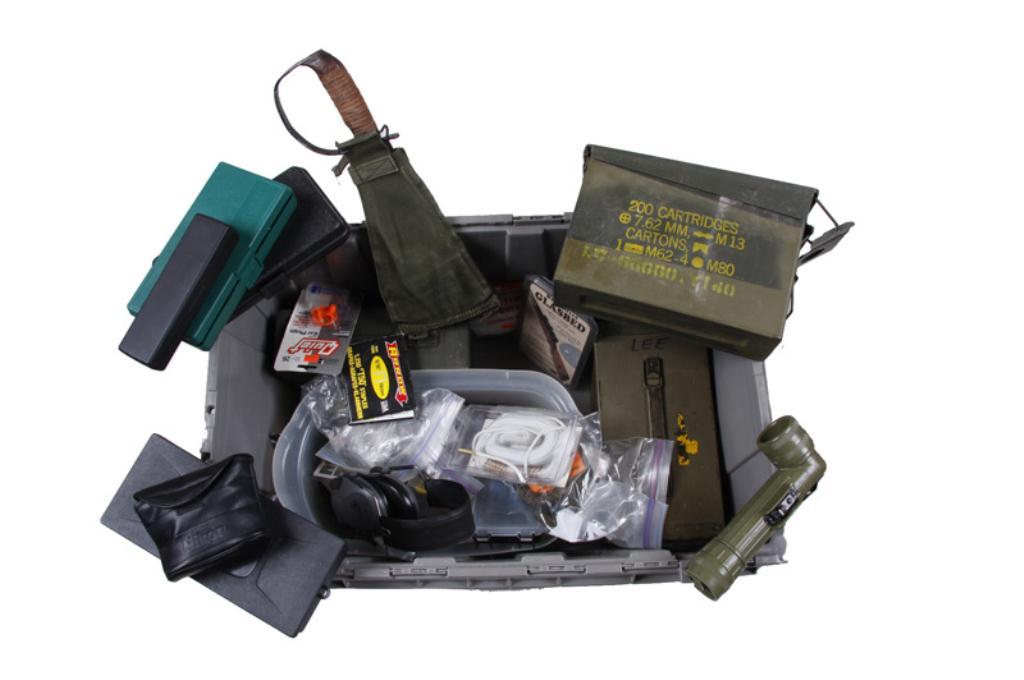 Bonanza Lot of Gun Stuff Includes 3 military ammo cans, gun accessories, binoculars, ear plugs, staple gun and staples, flashlight, military knife and lots more. Great gun show bonanza lot.Includes 3 military ammo cans, gun accessories, binoculars, ear plugs, staple gun and staples, flashlight, military knife and lots more. Great gun show bonanza lot.