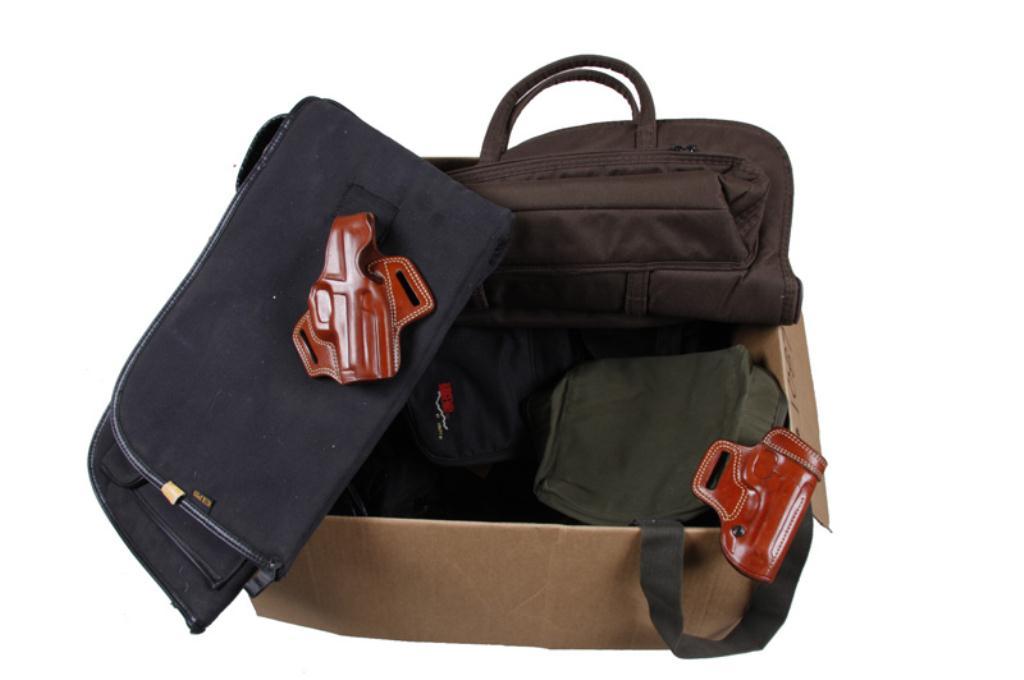Bonanza Lot of Holsters and More Consists of big box of mostly canvas gun bags, holsters, rifle gun rugs, plastic conceal carry pants holsters, leather holsters and other goods. Good lot for the gun shows.Consists of big box of mostly canvas gun bags, holsters, rifle gun rugs, plastic conceal carry pants holsters, leather holsters and other goods. Good lot for the gun shows.