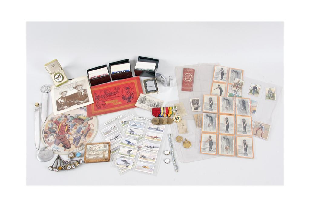 Bonanza Lot of Items Consisting of 3 decks of cards in bake-a-lite container, 4 collectors lighters, a collection of metal, a military theme cigarette holder, several cards found in tobacco containers, several Players cigarette collector cards, 2 letterConsisting of 3 decks of cards in bake-a-lite container, 4 collectors lighters, a collection of metal, a military theme cigarette holder, several cards found in tobacco containers, several Players cigarette collector cards, 2 letter openers,upholstery nail, and an enamel butterfly pendant.