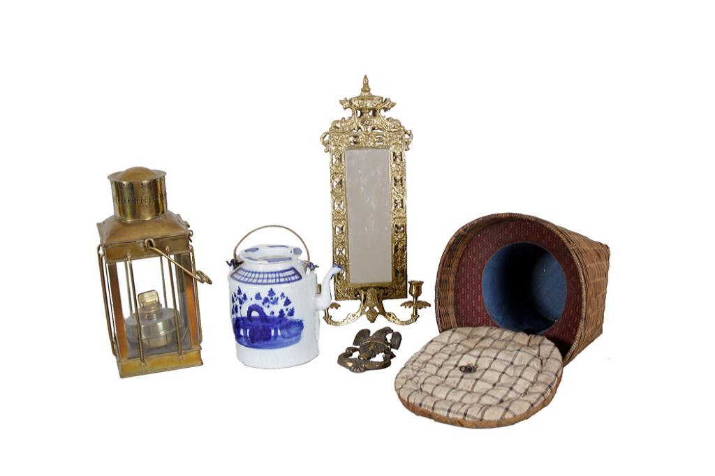 Bonanza Lot of Items Consisting of an Asian teapot and traveling container, a brass mirrored back candelabra, a brass doorknocker, and a brass kerosene lamp.Consisting of an Asian teapot and traveling container, a brass mirrored back candelabra, a brass doorknocker, and a brass kerosene lamp.