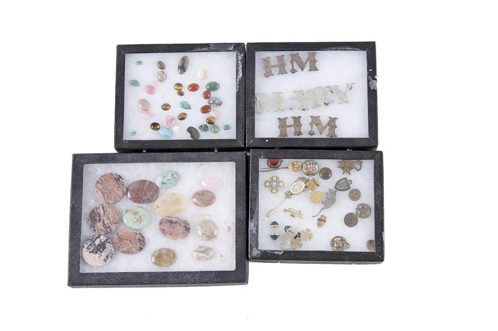 Bonanza Lot of Items Consisting of several polished stones ready for mounting in a riker mounts, a collection of pins in a riker mount, and a collection of sterling silver western letters used for monogramming hats or belts in a riker mount.Consisting of several polished stones ready for mounting in a riker mounts, a collection of pins in a riker mount, and a collection of sterling silver western letters used for monogramming hats or belts in a riker mount.