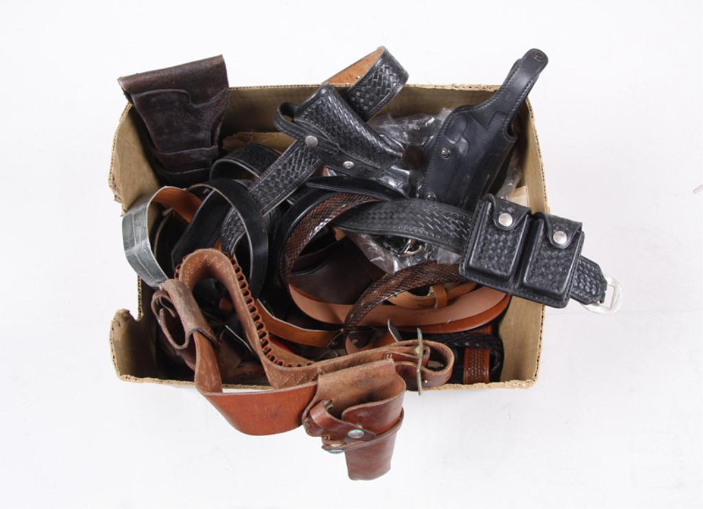 Bonanza Lot of Leather Consists of an assortment of leather belts, holsters, police rigs, and ammo pouches.Consists of an assortment of leather belts, holsters, police rigs, and ammo pouches.