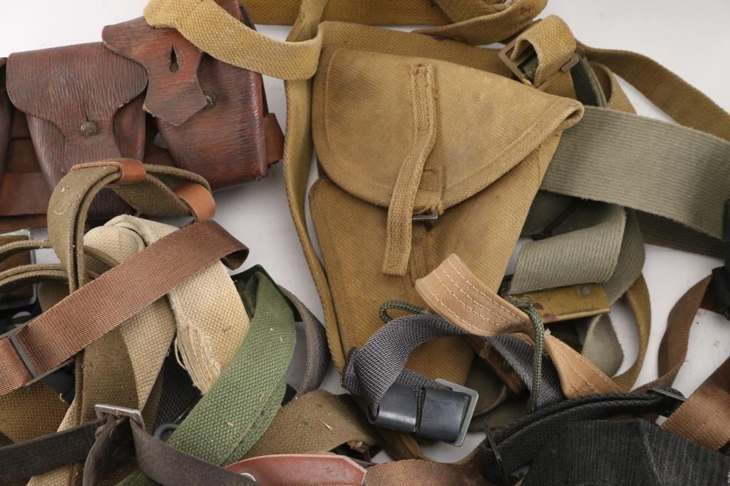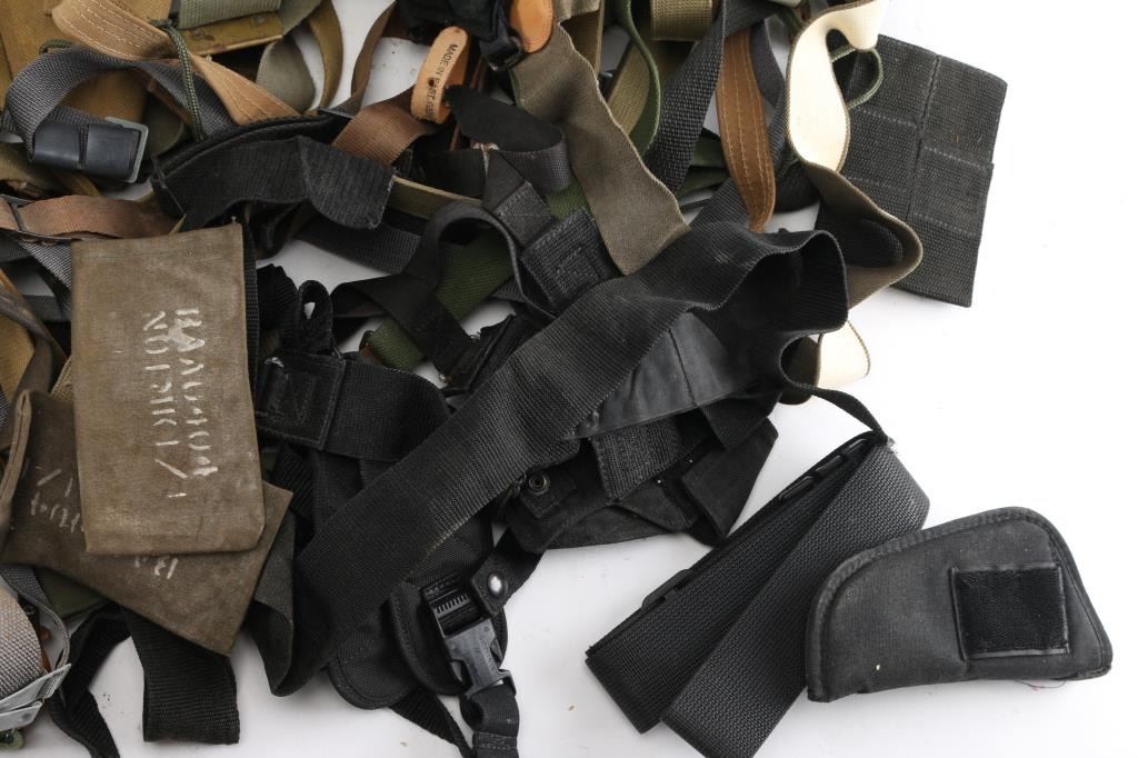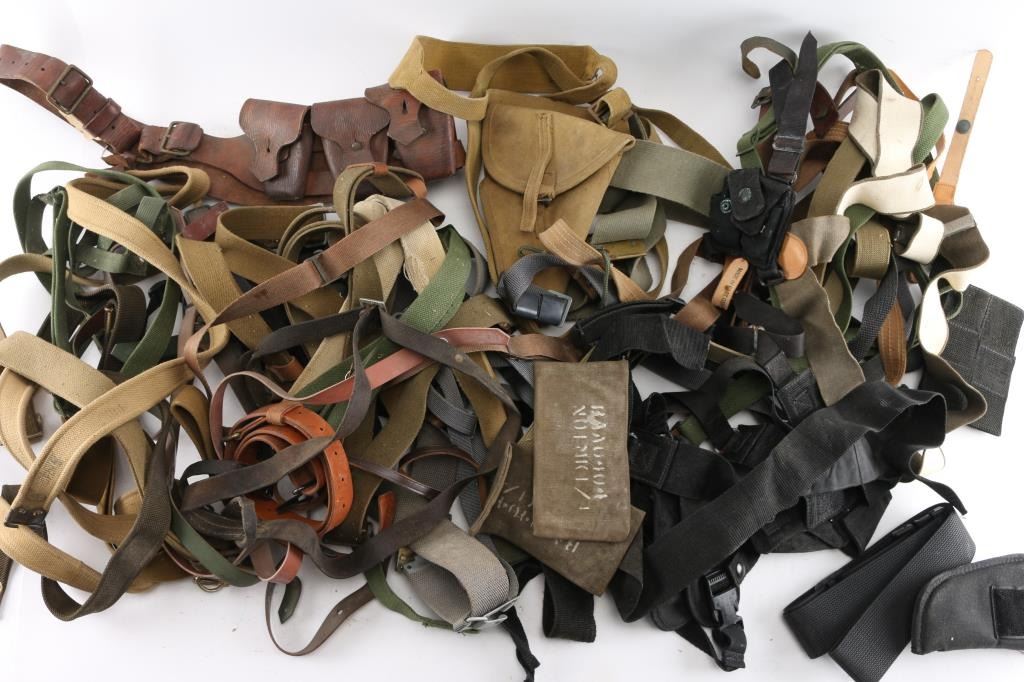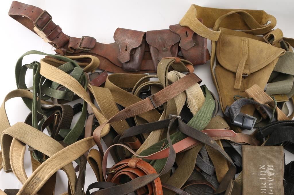 Assortment of leather, web/canvas, nylon slings for various rifles. Mostly used, from fair to good condition. Includes some ammo pouches & shoulder harnesses.