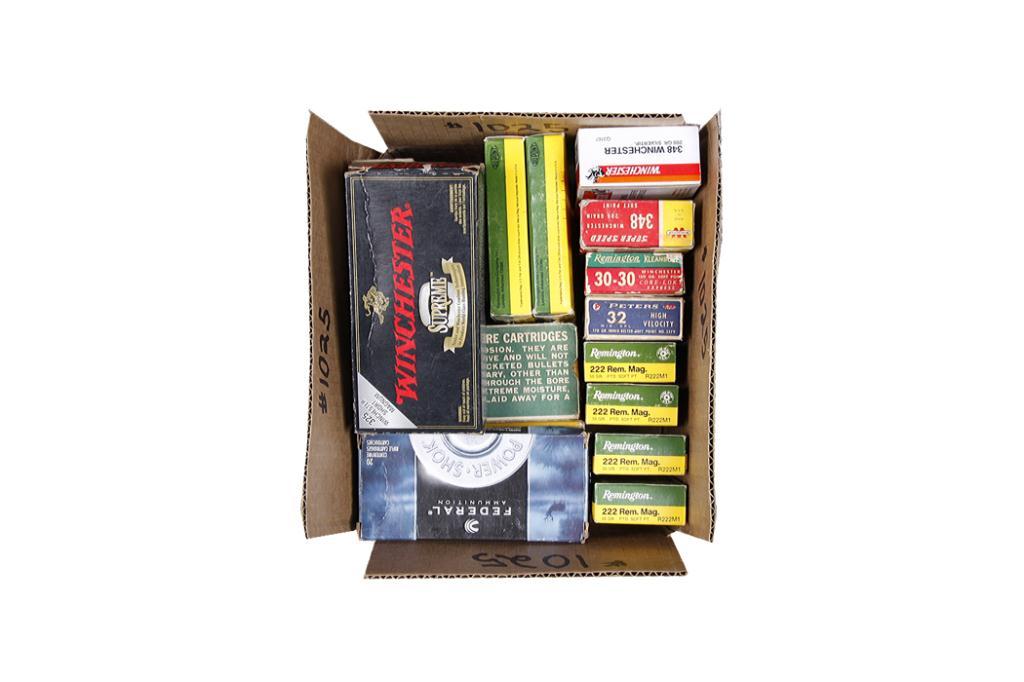 Bonanza Lot of Rifle Ammo Consists of full and partial boxes of .30-30, 7.7 Jap, .45-70Gov't, .348 Win, .38-56 Win, .32 Win Spl, .222 Rem Mag, .300 Savage, .35 Rem, .325WSM, and .30 Carbine. Nice lot of misc ammo.Consists of full and partial boxes of .30-30, 7.7 Jap, .45-70Gov't, .348 Win, .38-56 Win, .32 Win Spl, .222 Rem Mag, .300 Savage, .35 Rem, .325WSM, and .30 Carbine. Nice lot of misc ammo.