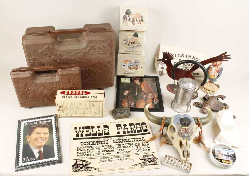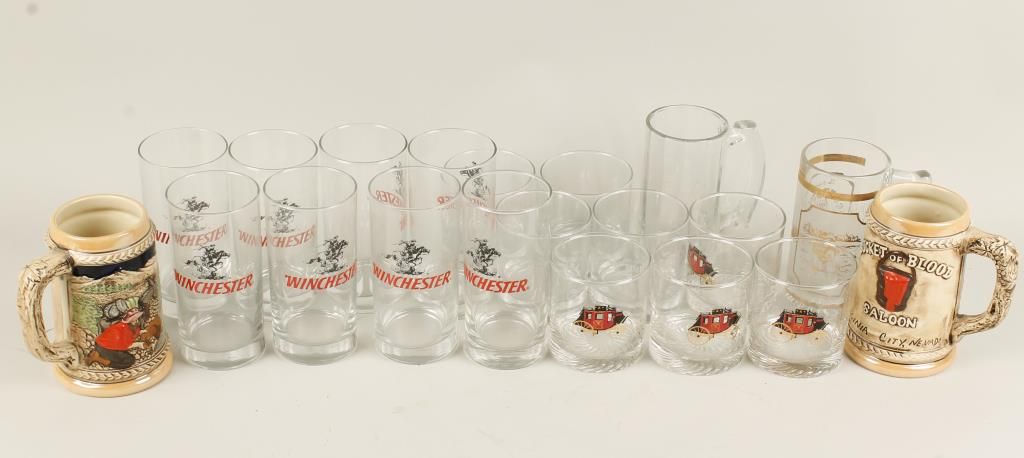 Includes decorative wall hangings, a Ronald Reagan tin sign, Winchester drinking glasses, steins, and much more.