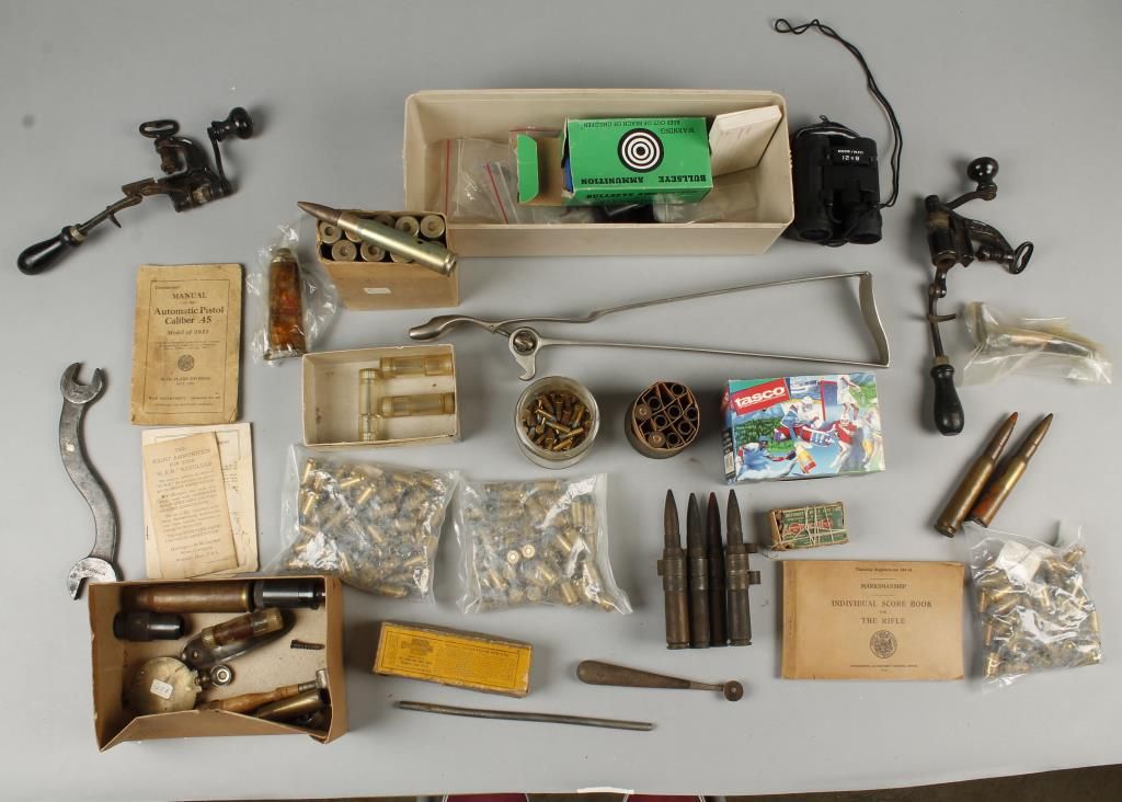 Including: 150 rounds of reloaded 45 auto, a UHDW reloading tool, 2 binoculars, a metal sock, 4 rounds of linked 50 cal vintage condition, various 50 cal shells, and vintage misc. gun parts.