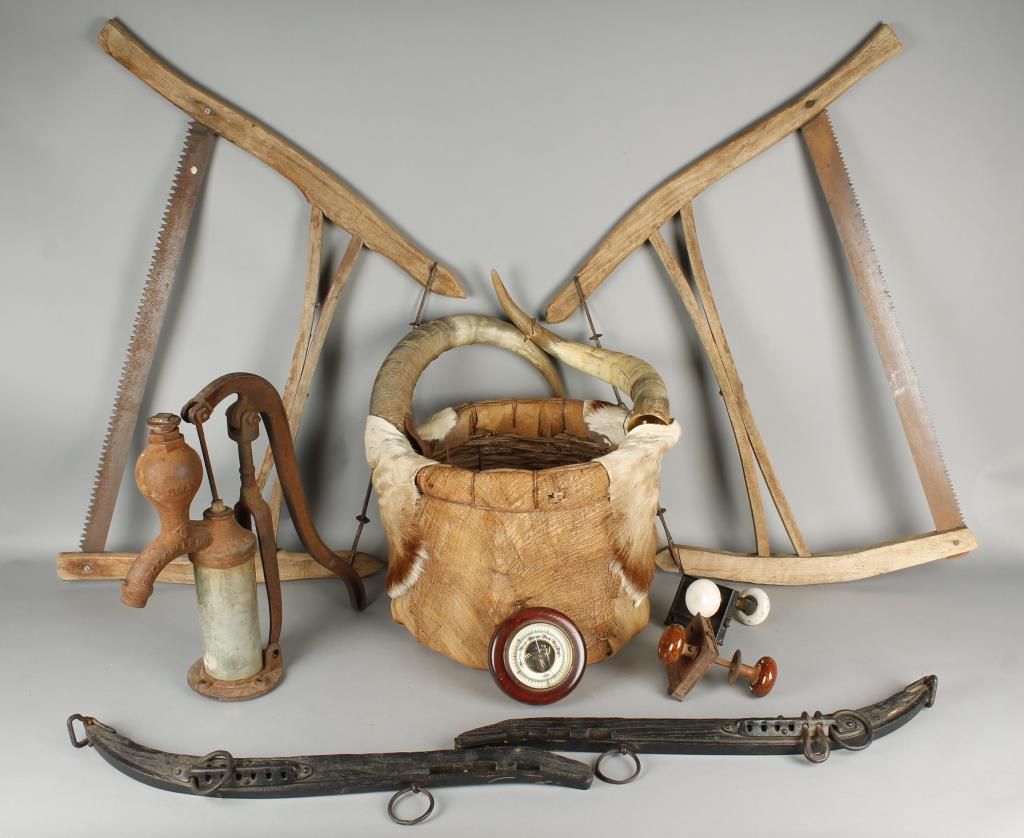 Including: 2 saws, hide wrapped basket with horns, 2 haines, water pump, vintage hardware, and more