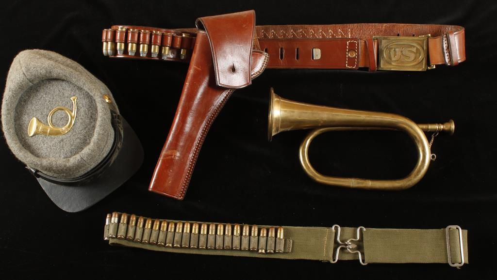 (1) Brass bugle, no visible markings, unknown age. In overall fair condition. Approx 11-1/2" long. (1) Cavalry hat, grey woo with black leather rim and strap. Buttons marked "C.S.A.", with bugle plaque on top. Size 7-1/4. (1) Army webbing cartridge belt. Adjustable green canvas belt holds (25) rounds of .38 special or .357 magnum. (1) Reproduction US 45 cal holster rig. Brown leather cartridge belt holds (36) rounds of .45 Colt or similar calibers. Buckle marked "US". Shows use and age. Approx 45" long.