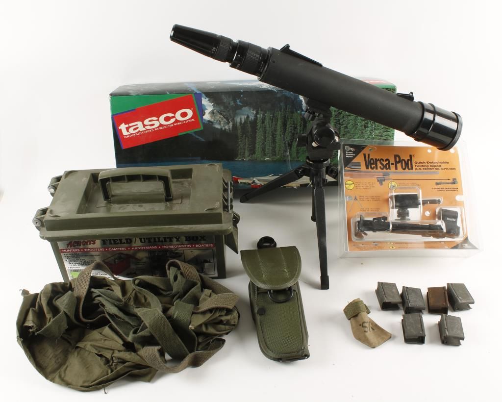 (1) Tasco Scope 20x60x60. 22 EB. Zoom with tripod. (1) Versa-Pod Quick Detachable Folding Bipod. (1) Cathey M-12 Military Holster. (1) Action's Field/Utility Box. And more.
