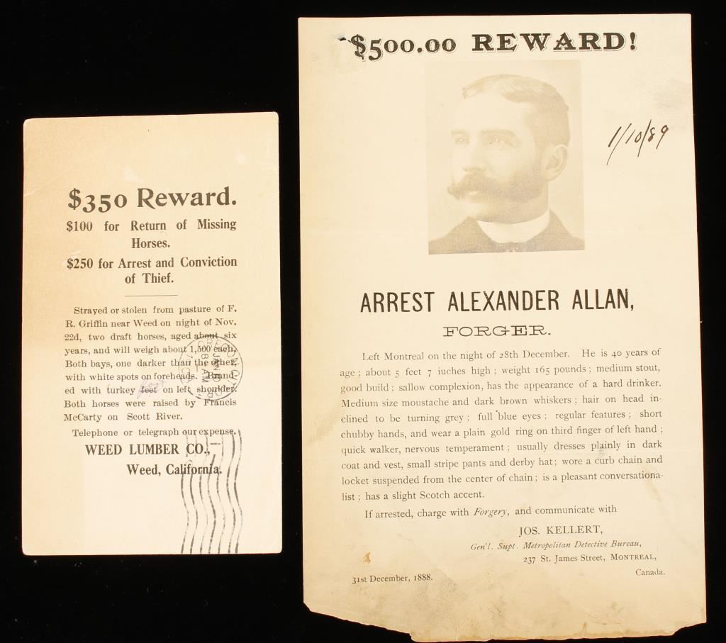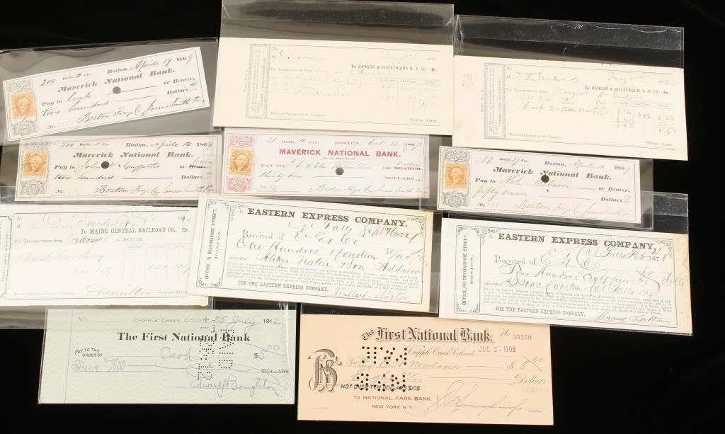 Vintage 1900 glass photo plates, old wanted posters, assorted circa 1860's-1900's cancelled checks-three of which have U.S. Federal cancelled stamps still attached.