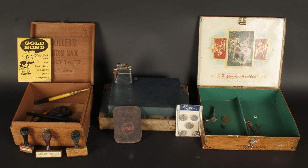 The Hoffman House Bouquet Vintage Cigar Tin, Image of nudes inside lid. Green cloth lining. With losses to paint and dents in metal. Approx 10" x 8-1/2" x 2". And books including (1) "The National Magazine Devoted to Literature, Art, and Religion" Volume I July to December, 1852. (1) "The United States and Peace" by William H Taft, 1914.(1) Gold Bond stamp book 1948, with some pages filled in with stamps. (1) Vintage Sears lighter in case. And more.