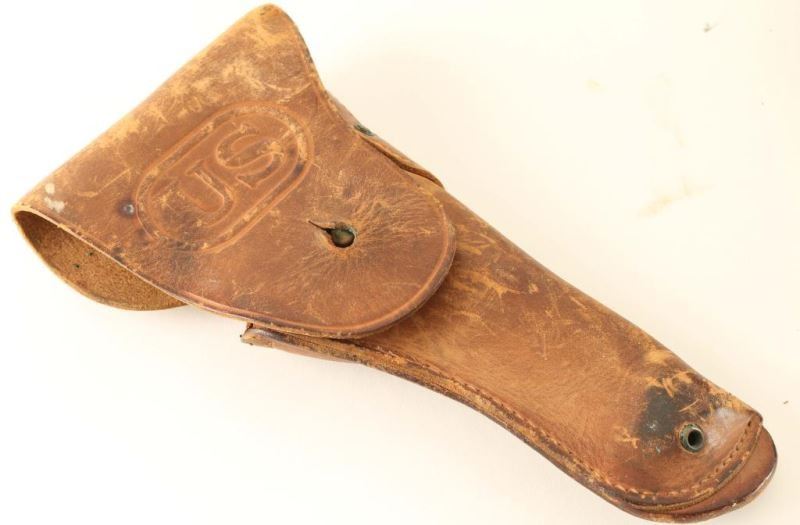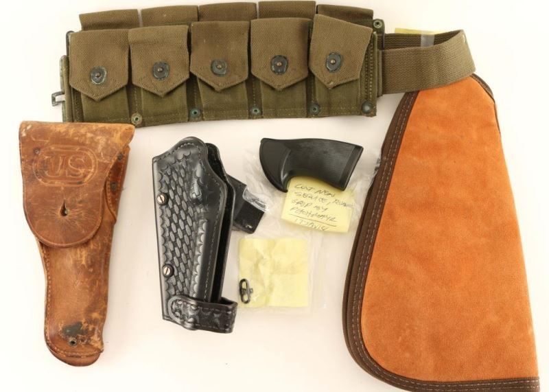 Including: M1 Garand bandolier marked 'US', Safariland leather competition holster, Pachmeyer Colt New Service grips, Colt New Service ring assembly, US flap holster with GI's name, and a Safariland gun rug.