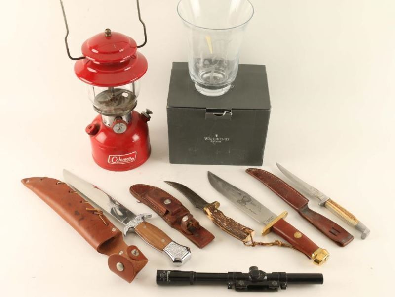 Including; Schrade knife with faux stag handle measures 9 1/2" overall with brown leather sheath, The Wild West Bowie Knife No. 6 etched with Jim Bridges-12 1/2" overall, Large Carvel Bowie with wood handle and leather sheath-14 1/2" overall, Q Knife with faux bone handle-10 "overall with 'Q' leather sheath, a red Coleman kerosene lantern, Glenfield 4x15 scope, and a Philip O'Keefe Waterford Crystal vase with botanical motif. Something for Mr. & Mrs.