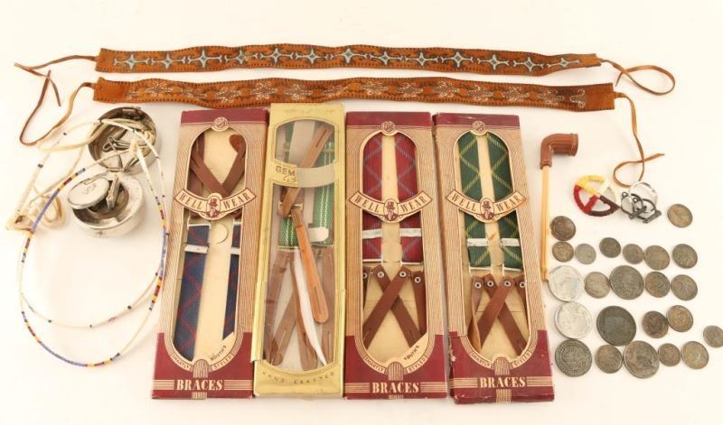 Including; several faux coins used for hat or belt buckle decoration, German made pocket lantern, small tobacco pipe, miniature stirrups, 4 Wellwear suspenders, 2 leather hatbands and 2 quillwork hatbands,