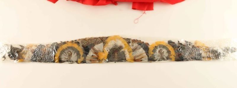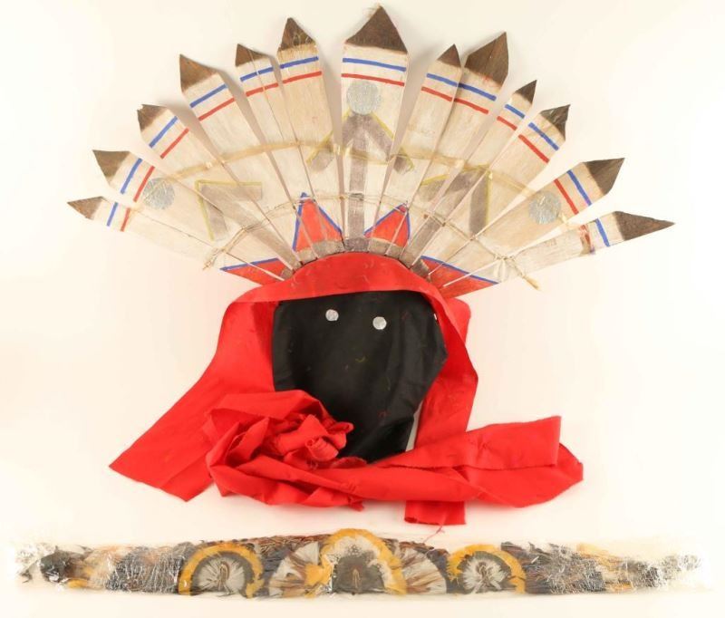 Apache Devil Dance Headdress with painted wood and red and black cotton cloth construction with foil eyes. Measures 22"x34". Also included is a feather hat band in yellow, brown and white 36"l x 3 3/4"h.