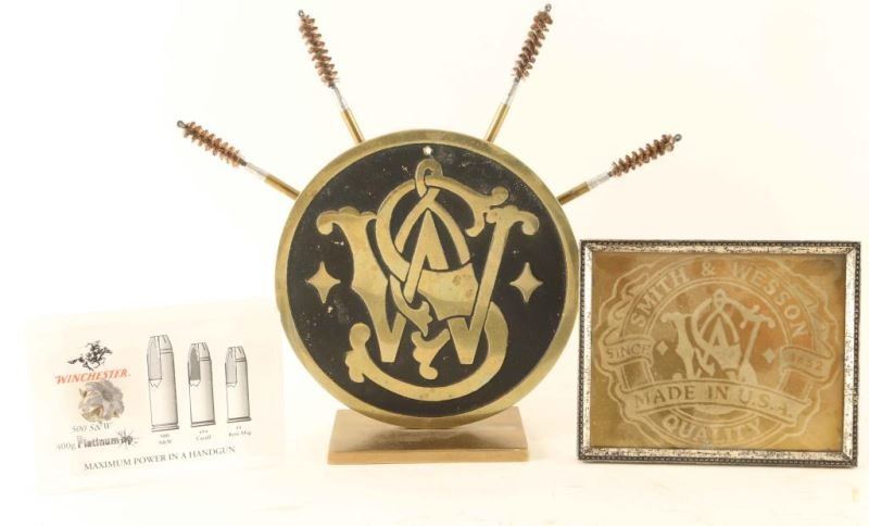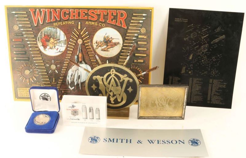 (2)S&W Banners,S&W Brass Desk Display, Winchester Paper weight, Winchester Tin Repro Sign, S&W Silver Coin, and more.