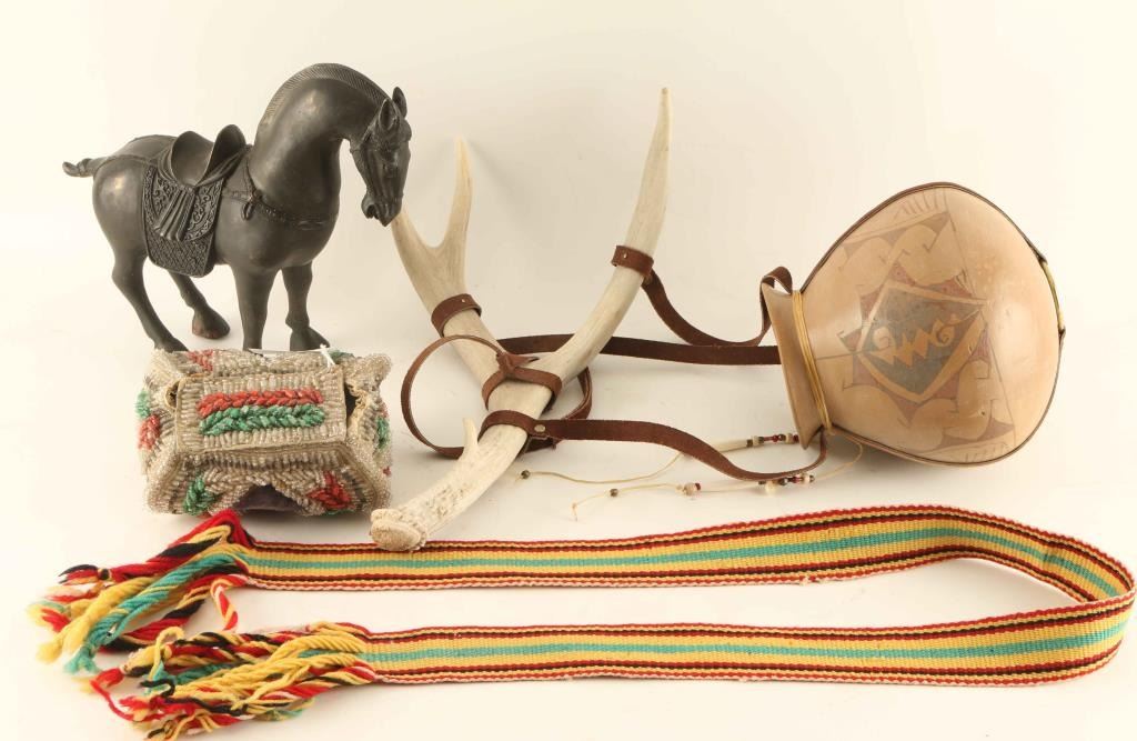 Iroquois beaded bag, Bronze Asian Horse, Hopi Sash, Casa Grande Pottery Jar with antler hanger.