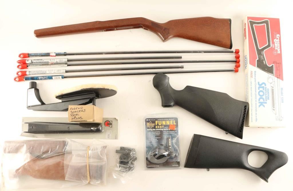 Including; (2) wood stocks, (2) composite stocks, custom shoulder stock for Crosman air pistol, handgun rest, stock spacers, ramrods and a funnel rest.