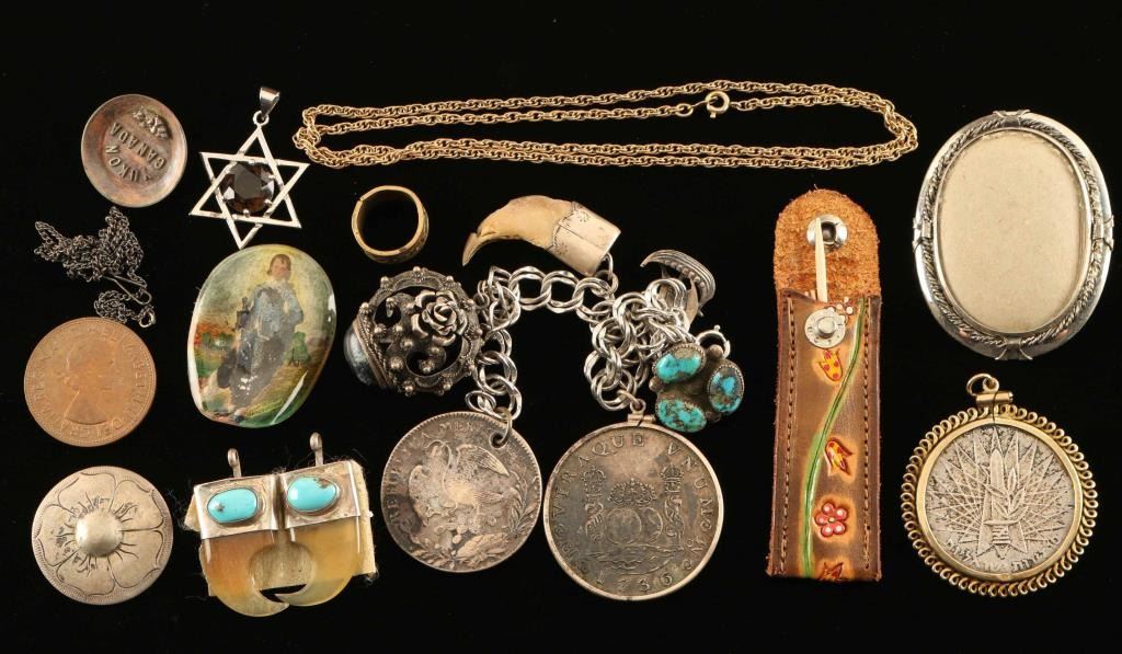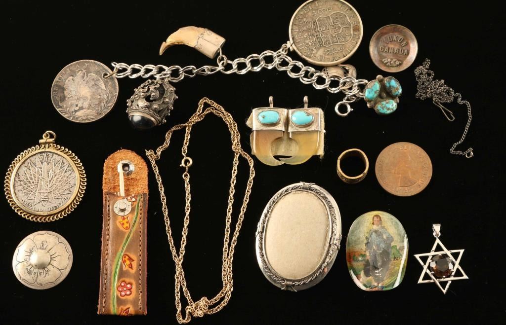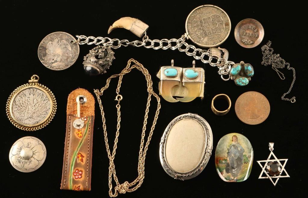 Star of David Pendant, Foreign coin pendant, charm bracelet, 2 claw pendants, Yukon Canada pin.