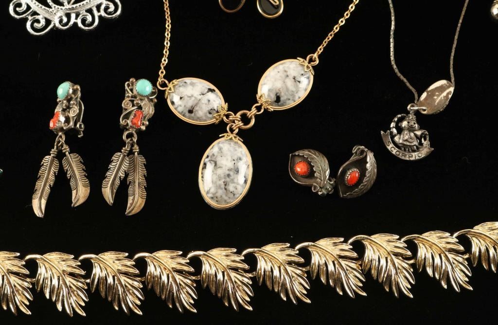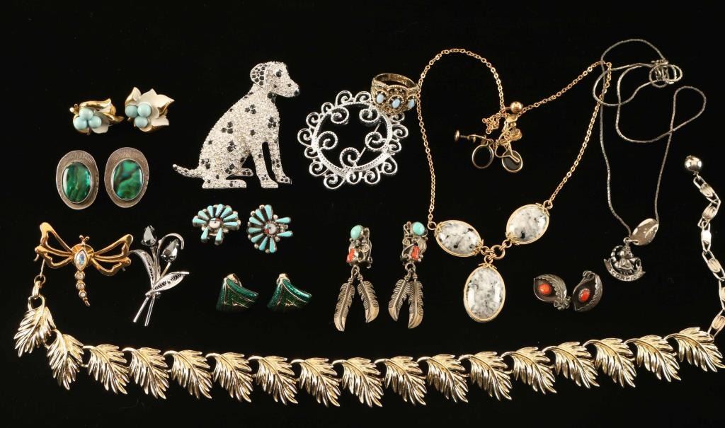 Lot of cosmetic jewelry including; sparkling Dalmatian pin, gold metal leaf necklace, dragonfly pin, Scorpio necklace, earrings and more.