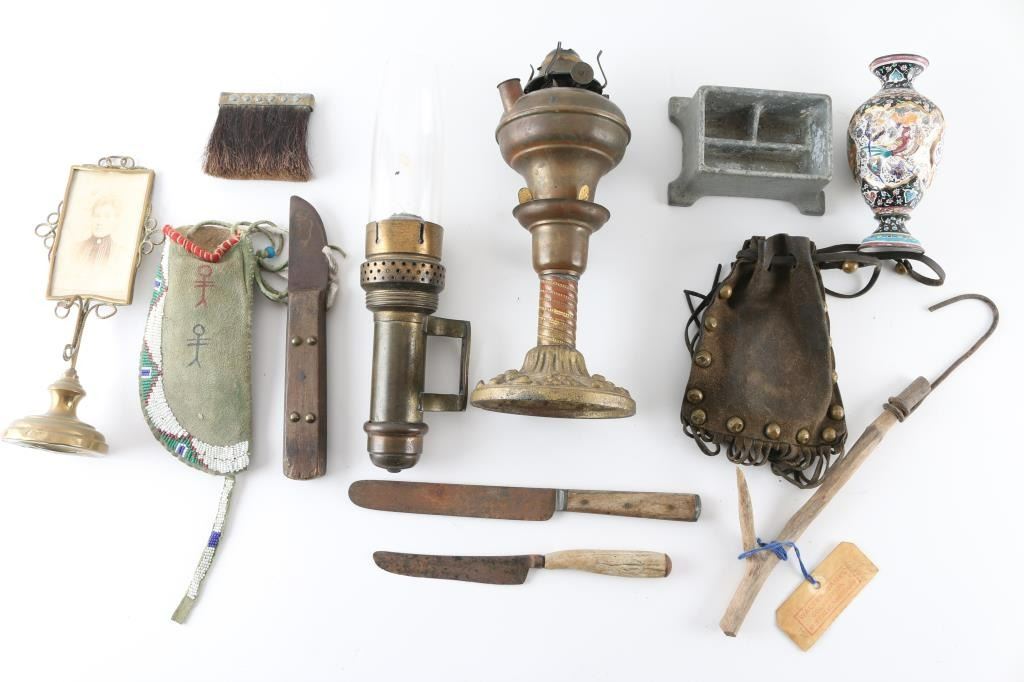 Includes a "strike a light" leather sheath , brass photo holder, Indian sheath and knife, two primitive butter knives, antique coat brush. Also has a middle eastern vase, kerosene lamp, & wall mounted lamp holder.