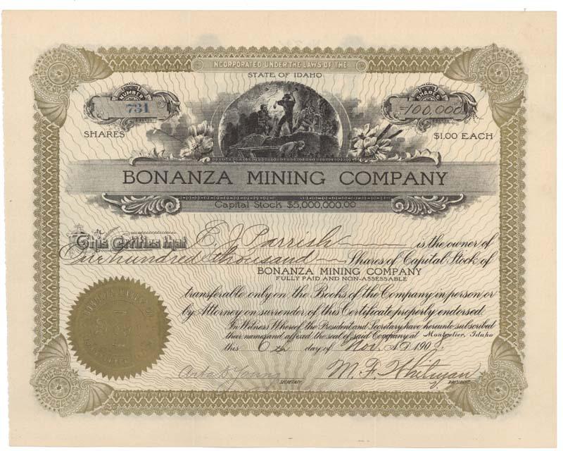 1908, Idaho. Stock certificate for 100,000 shares. Gold/Black. Vignette at top center of miners at work. Uncancelled and extremely fine.