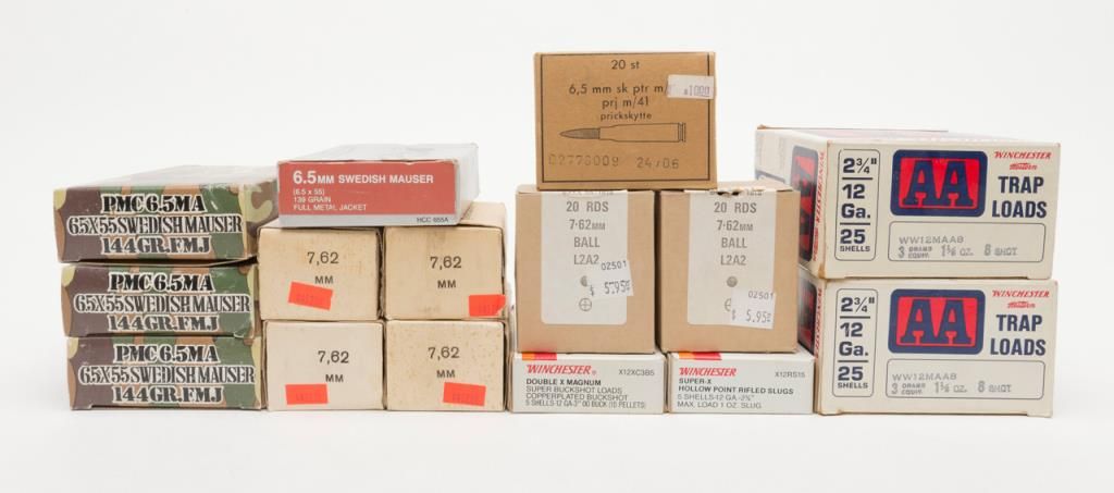 Bonanza ammo lot consisting of five boxes of 6.5 x 55 Swedish Mauser ammo totaling 100 rounds. Four boxes of 7.62 Nagant wadcutter ammo totaling 200 rounds. Two boxes of Winchester 12 gauge, 2 ¾” trap loads and two boxes of Winchester 12 gaugerifled slugs, along with 40 rounds of 7.62 mm ball ammo marked “Made in England”. A little something for everyone in this lot. Est.: $150-$300.