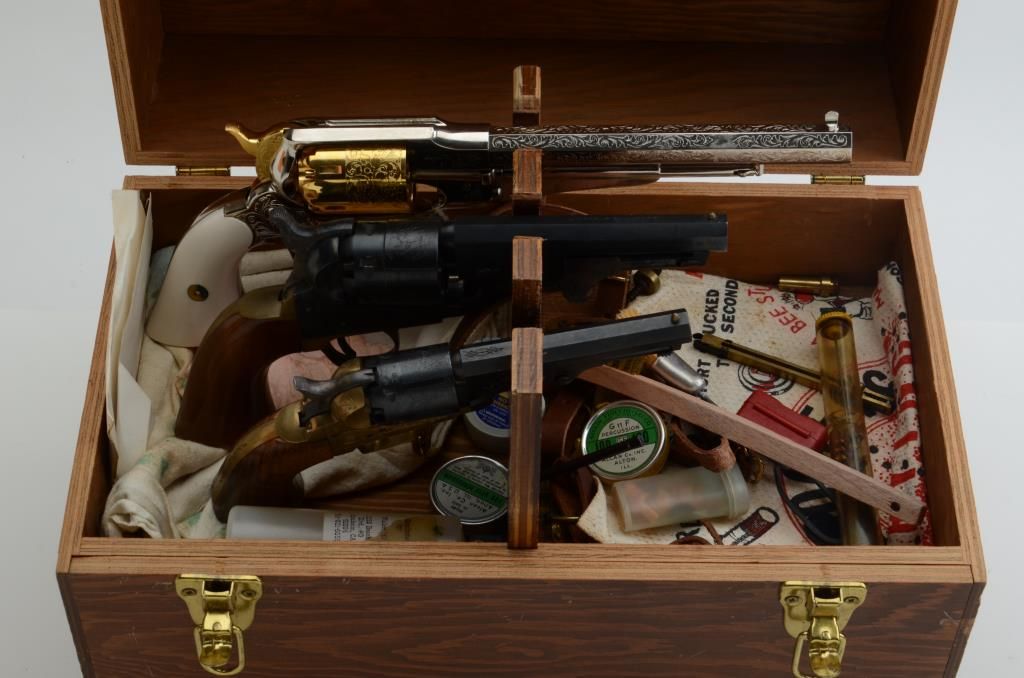 Bonanza blackpowder shooters lot consisting of a modern Italian-made percussion engraved copy of a Remington Model 1858 Army revolver, .44 cal., 8” barrel, nickel finish with gold wash accented cylinder and hammer, fauxivory grips, #SG1147 in like new condition with a flap leather holster plus two additional Italian-made modern blackpowder percussion revolvers, one a .44 cal., #26475 in fine overall condition, the other .31 cal. with a brass frame and also in fine condition, #D399; with these guns comes a wooden shooter’s box with misc. cleaning accessories and a set of Lee powder measures. A great set-up for the blackpowder shooter! Est.: $250-$500.