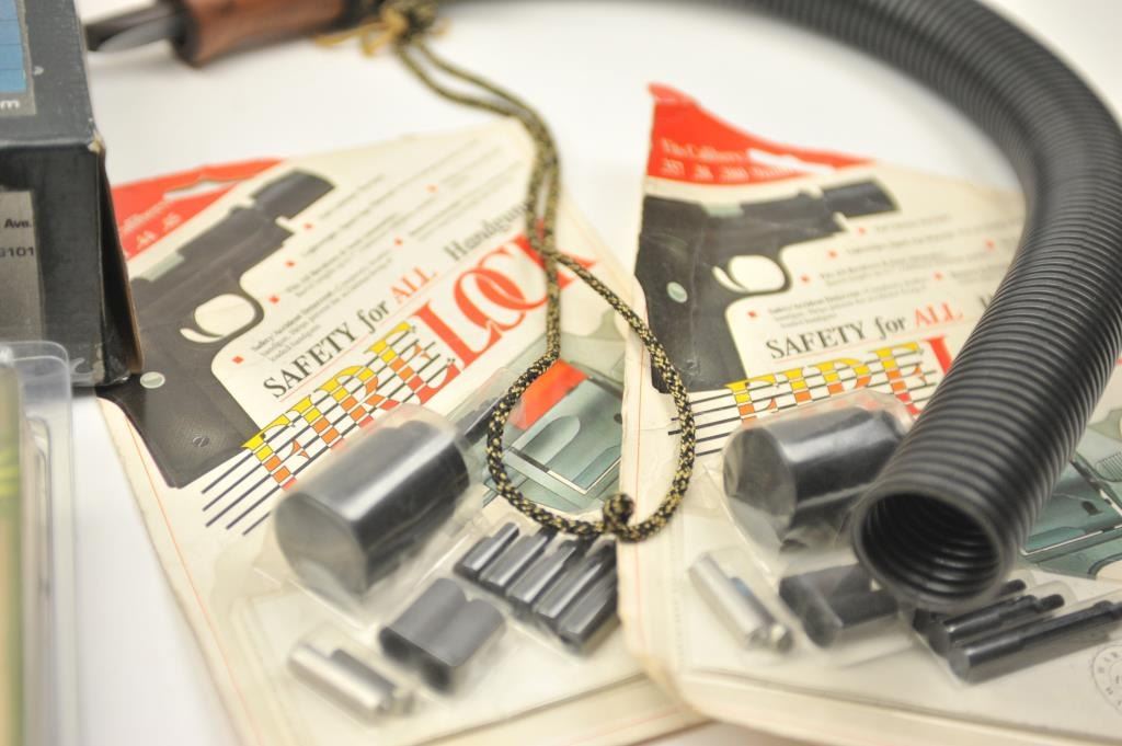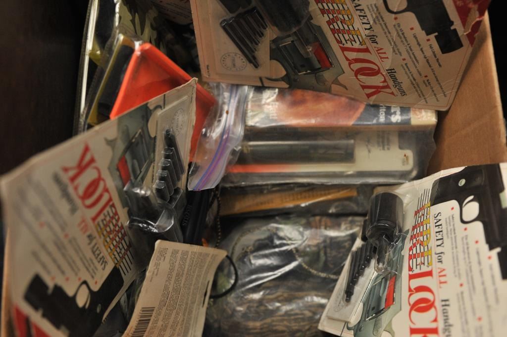 Bonanza box lot of hunting gear with grunt tubes, duck and goose calls, rattles, bear calls, varmint calls, game scales, slings and videos along with other accoutrements. A bonanza for the gun show circuit or huntingenthusiast. Est.: $175-$350.