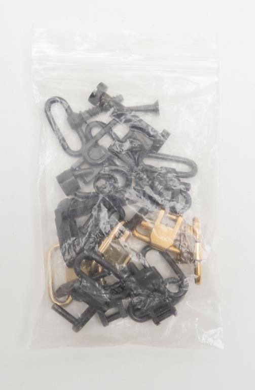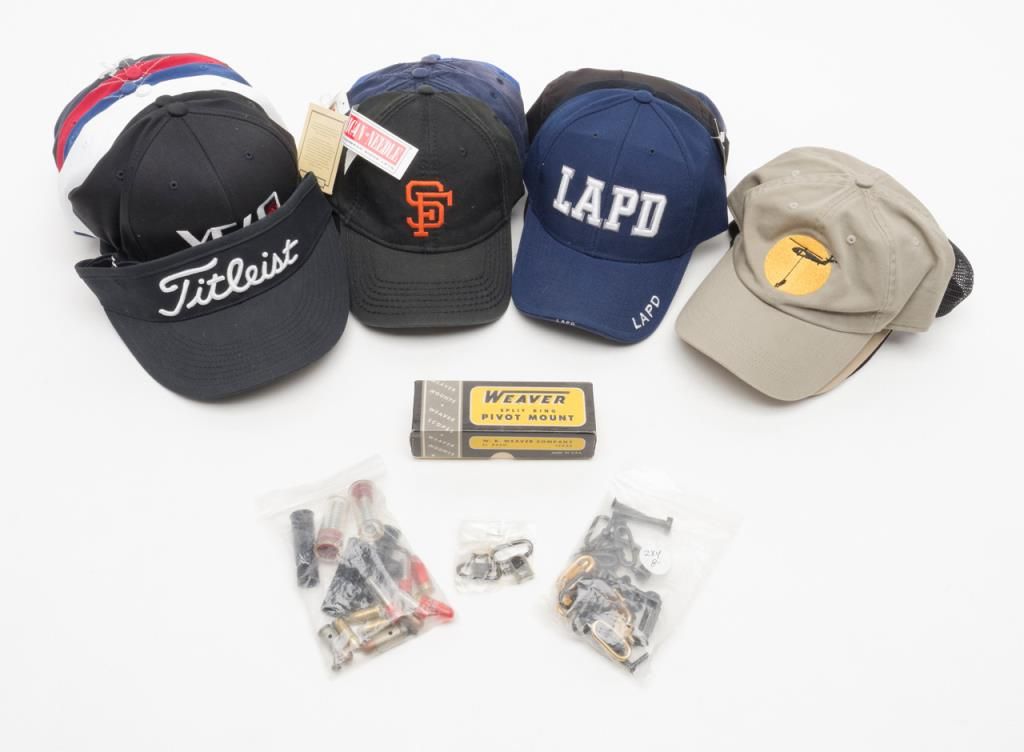 Bonanza collector’s lot; approx. a dozen and a half of misc. baseball caps including different baseball team caps, golf product advertising caps, etc. plus a small lot of misc. gun-related items including various size snap caps and slingswivels. Est.: $100-$150.