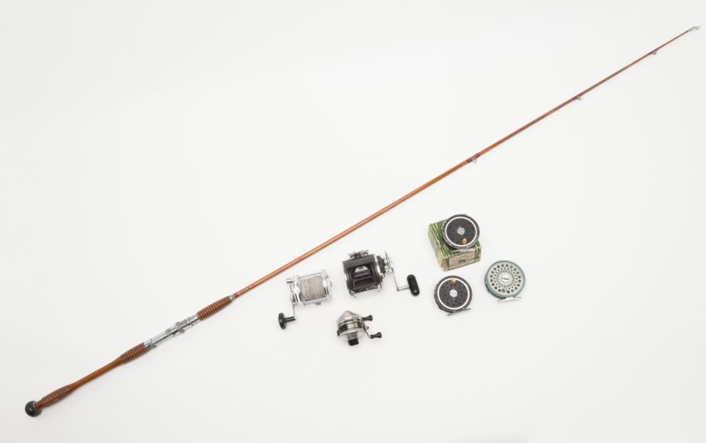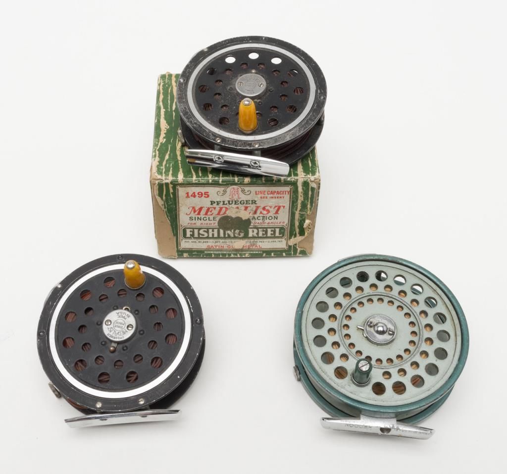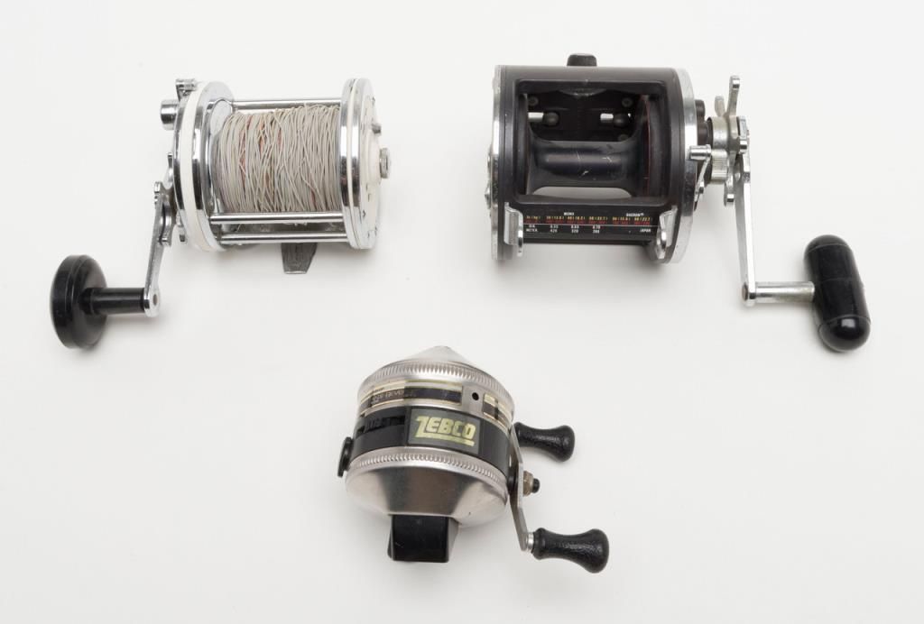 Bonanza fishing lot consisting of 2 vintage Pflueger Medalist fly reels, one with original box; a Heddon Model 340 fly reel; a vintage Zebco 33 Rhino tough reel; a Garcia Mitchell model 624 Heavy duty trolling reel, lead core, color codedline with large cranking knob; a Daiwa Model 400HW Heavy duty trolling reel and a wood fishing poll; all in good to very good condition. Est.: $150-$300.