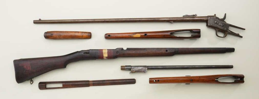 Bonanza lot 13 misc. gun stocks, barrels and partial actions including a Japanese Arisaka “last ditch” stock and wood butt plate; a British Model 1917 or U.S. Model 1917 rifle stock; what appears to be the top stock of aU.S. 1903 or 1903-A3; two fore stocks for Enfield rifles; an unmarked fore stock for a shotgun; a barrel for a 1911 pistol and an unidentified military take down tool of some type; Remington rolling block action andbarrel; an unmarked shotgun barrel with Weaver muzzle choke; an Arisaka rifle receiver and barrel with ground mum (no bolt and missing parts); a military rifle barrel and a Sears Model 2T rifle barrel andreceiver (missing internal parts); a real gunsmiths lot. Est.: $150-$300.