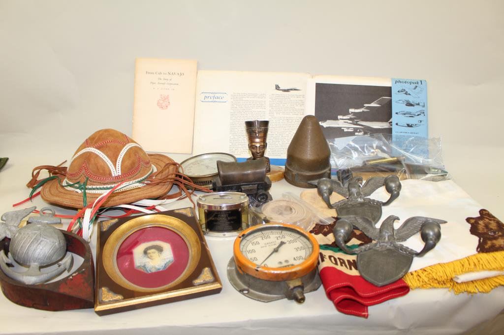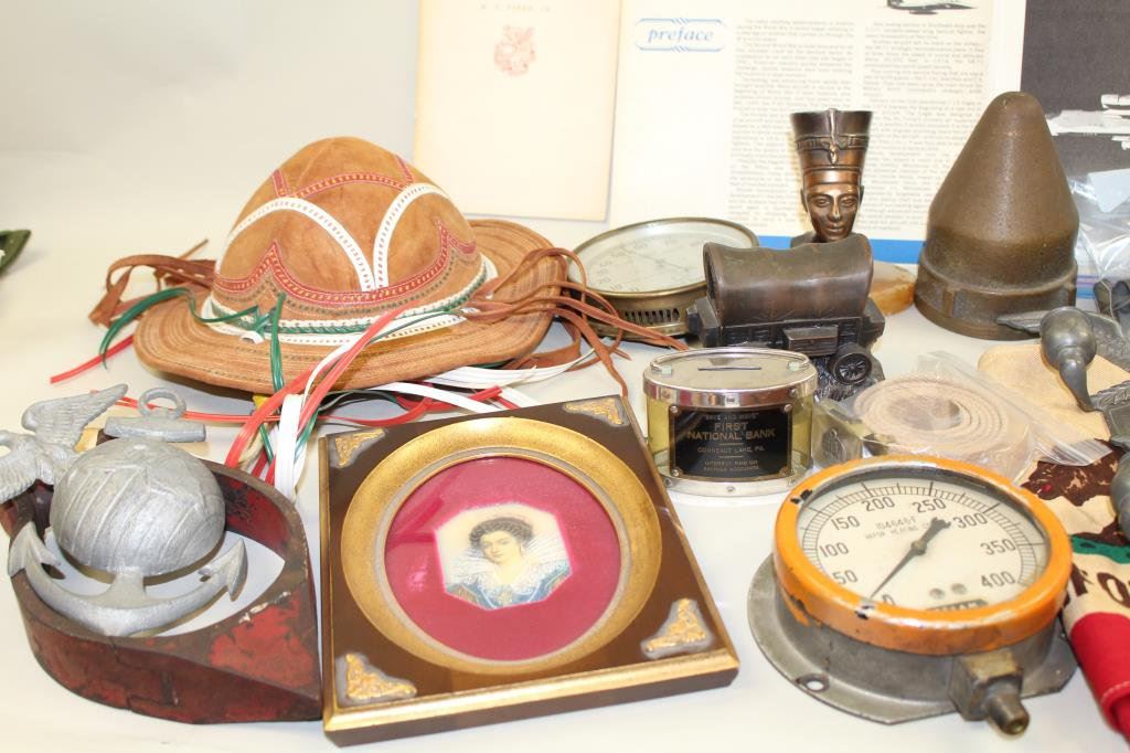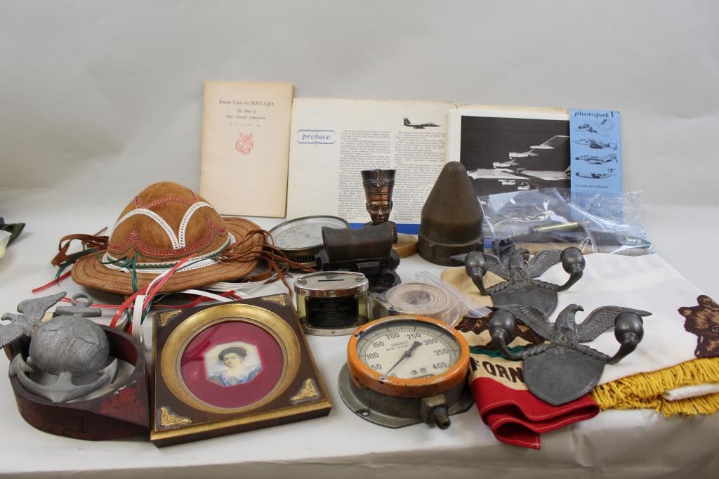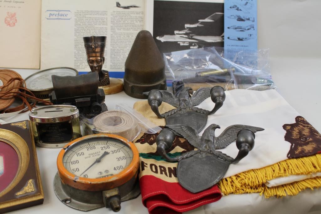 A tire lock, steam gauge, humidity indicator, 2 banks vintage, Cal. Banner, Vintage WWII empty shells, Egypt head, and more. Est:$150-300